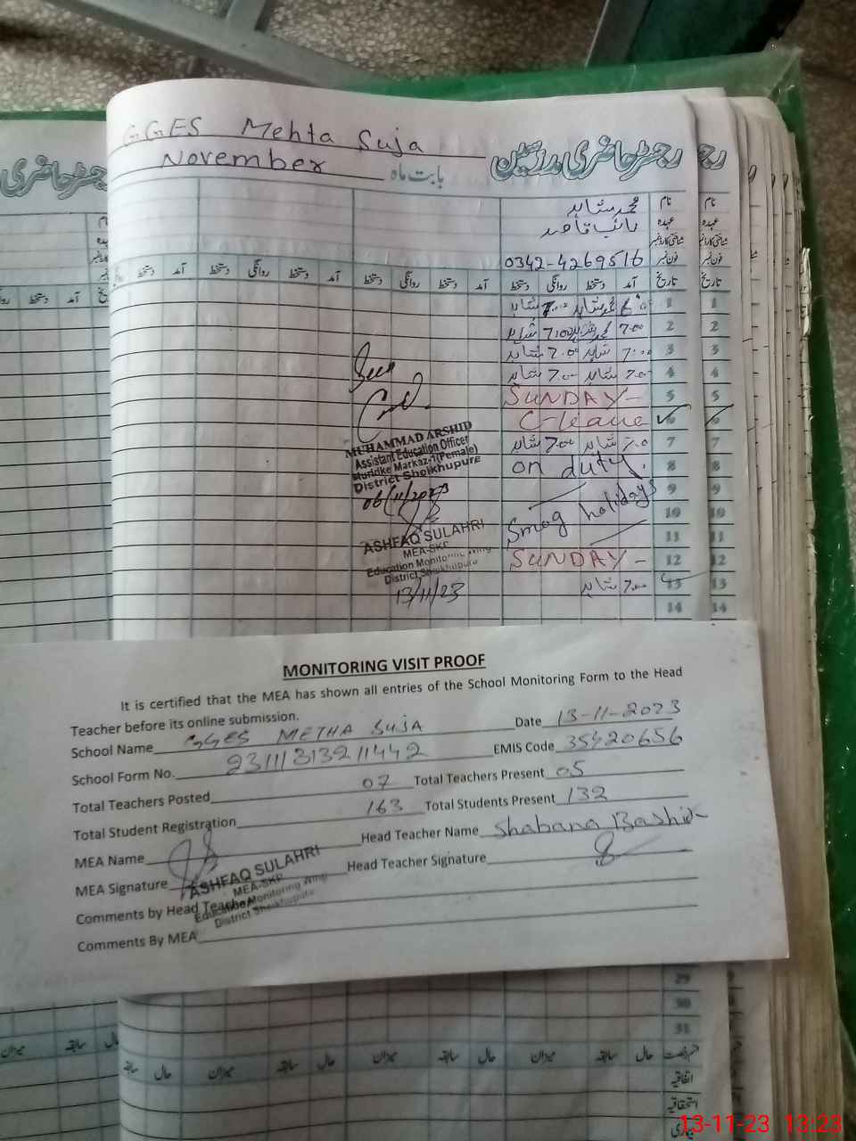 | Attendance Register | Head Teacher | MEA with School | Visit Proof |
