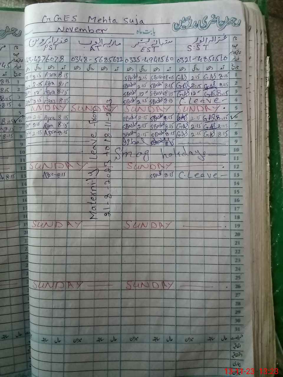 | Leave | Duty | Absent | Maternity | Medical | Ex- Pak |