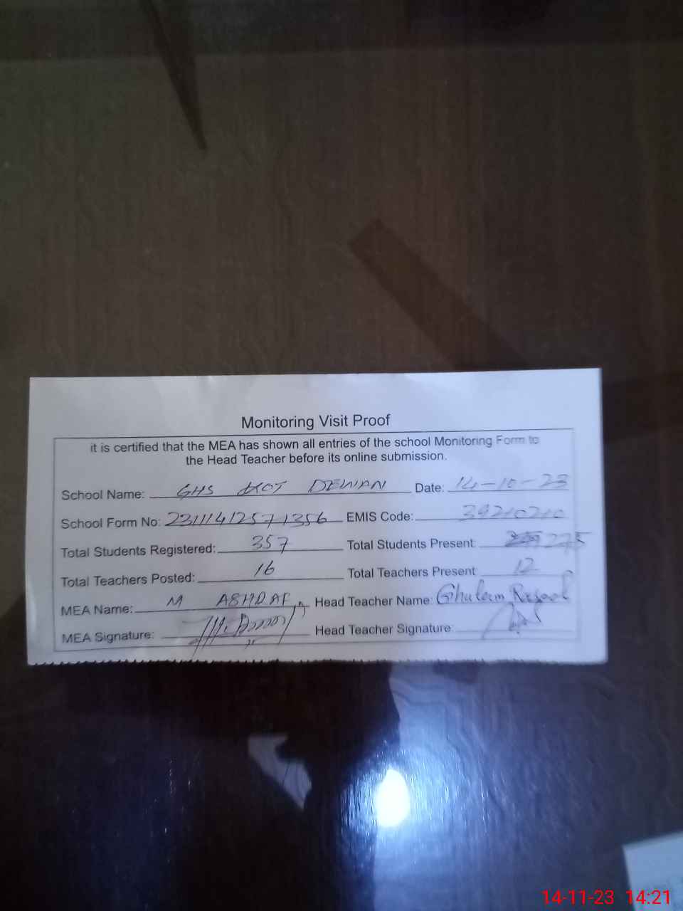 | Attendance Register | Head Teacher | MEA with School | Visit Proof |