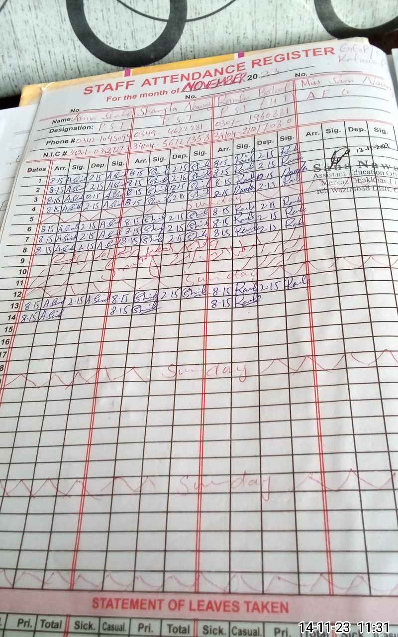 | CNIC | Full Name | Designation | R/C | Absence During Last Calender Month |