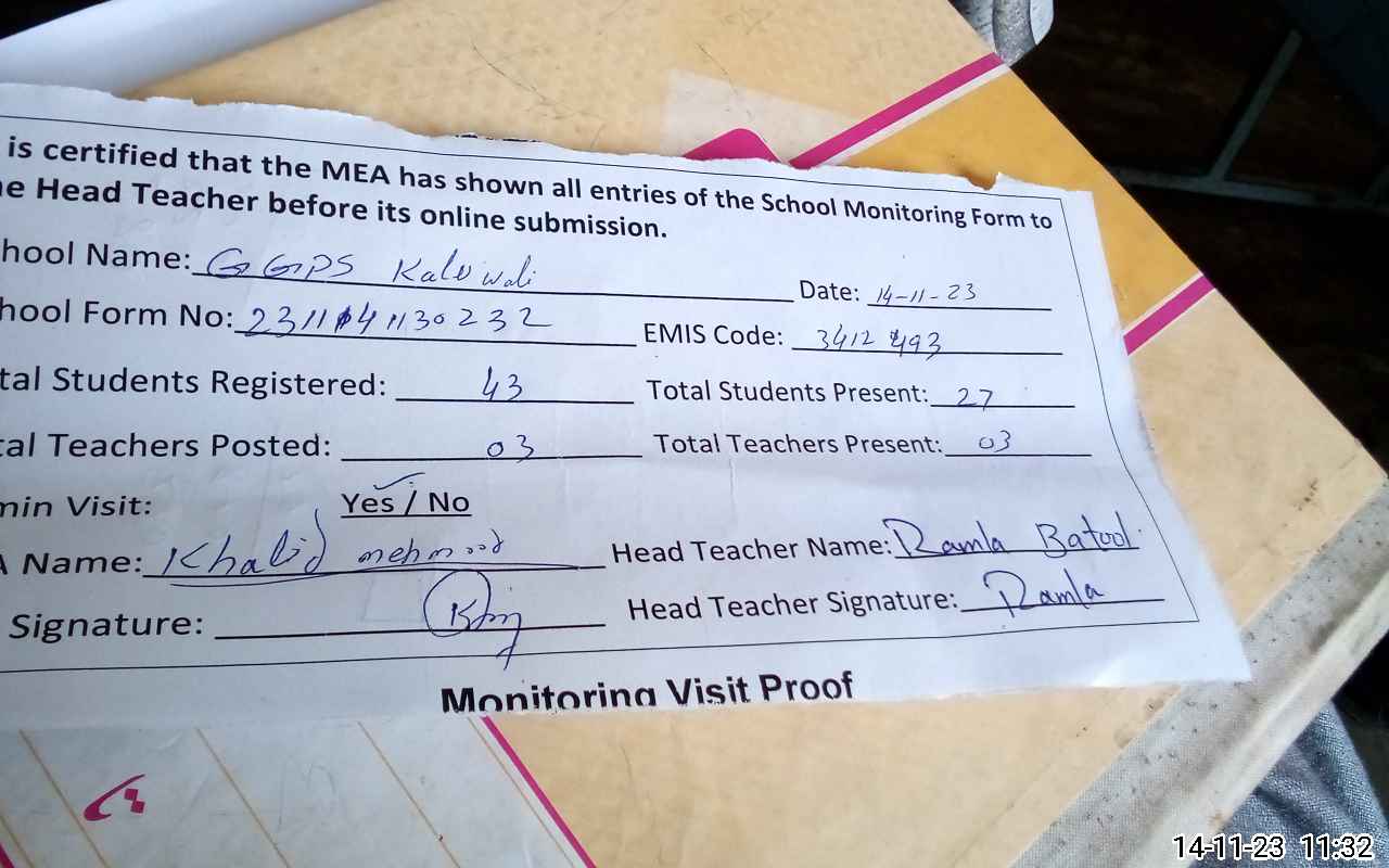 | EMIS Code: 34120493 | Name of School: GGPS KALU WALI | |||