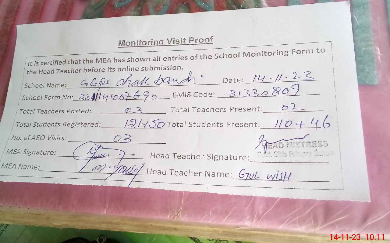 | EMIS Code: 31330809 | Name of School: GGPS CHAK BANDI | |||