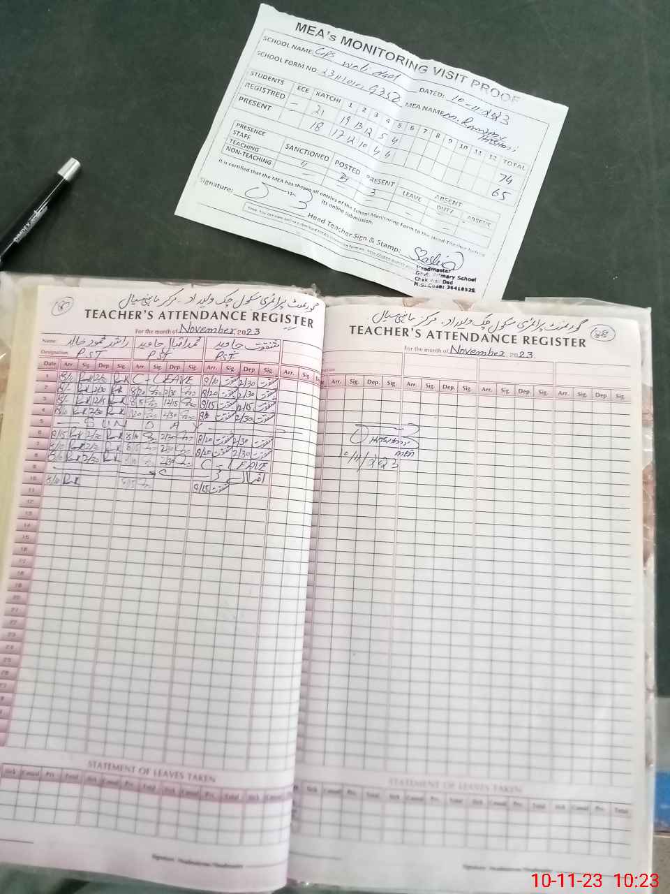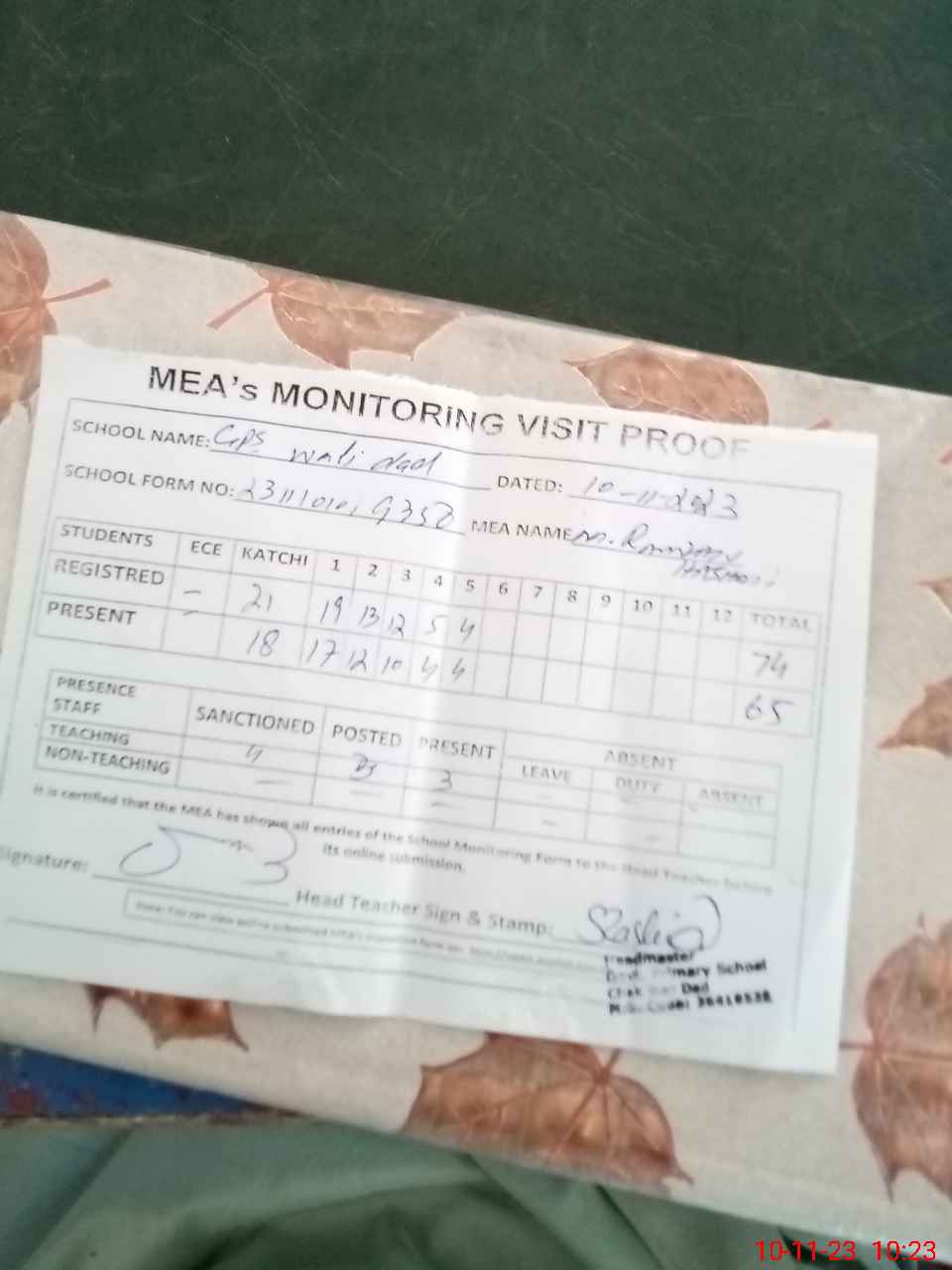 | Attendance Register | Head Teacher | MEA with School | Visit Proof |