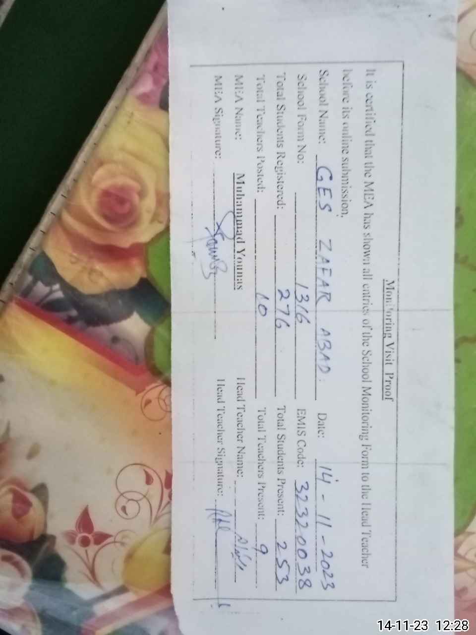 | Attendance Register | Head Teacher | MEA with School | Visit Proof |