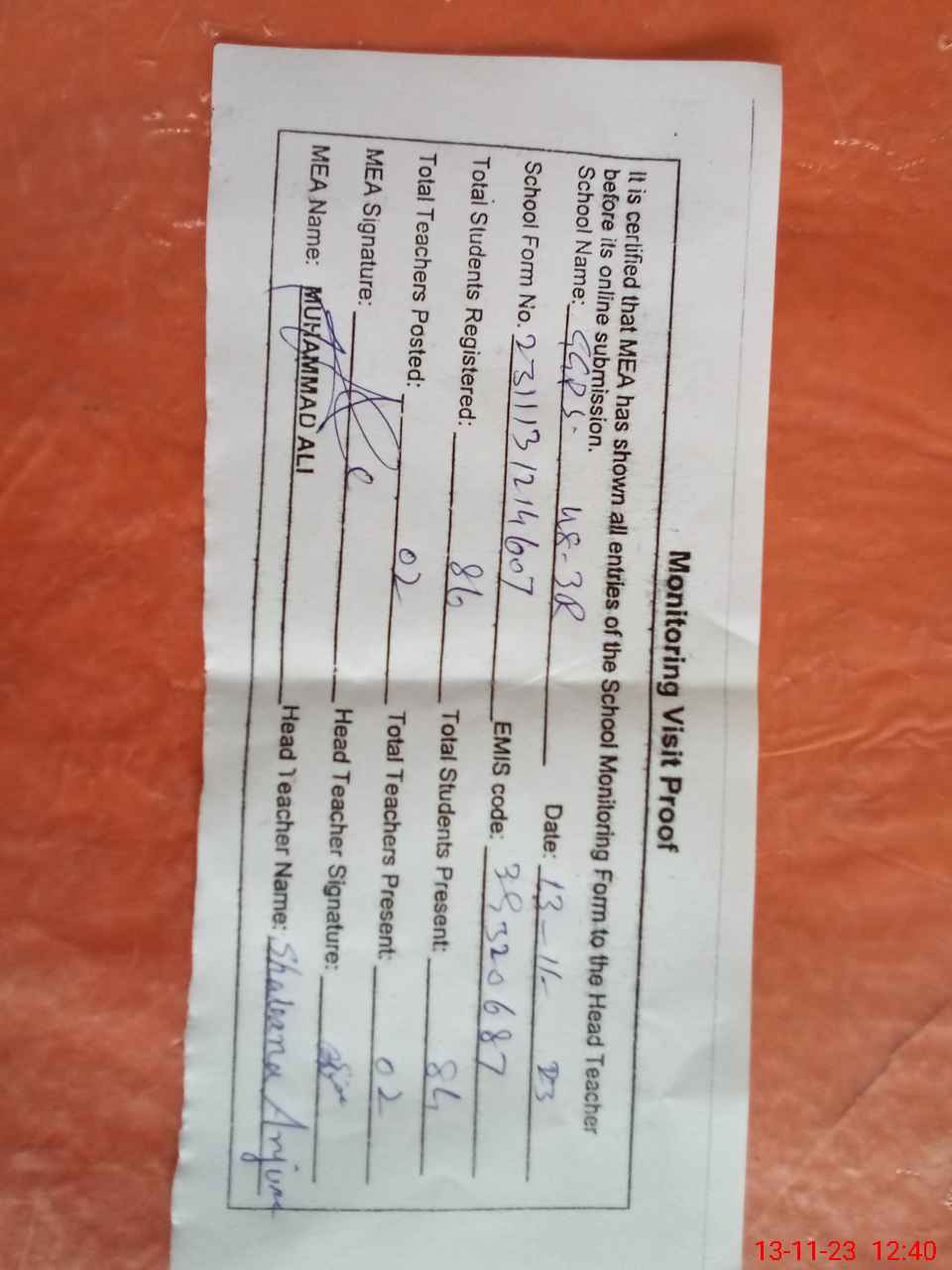 | Attendance Register | Head Teacher | MEA with School | Visit Proof |