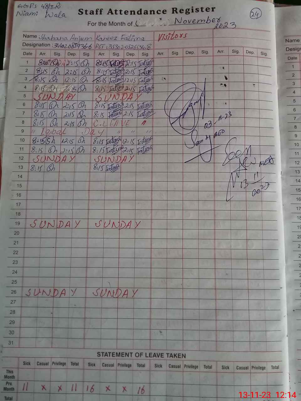 | CNIC | Full Name | Designation | R/C | Absence During Last Calender Month |