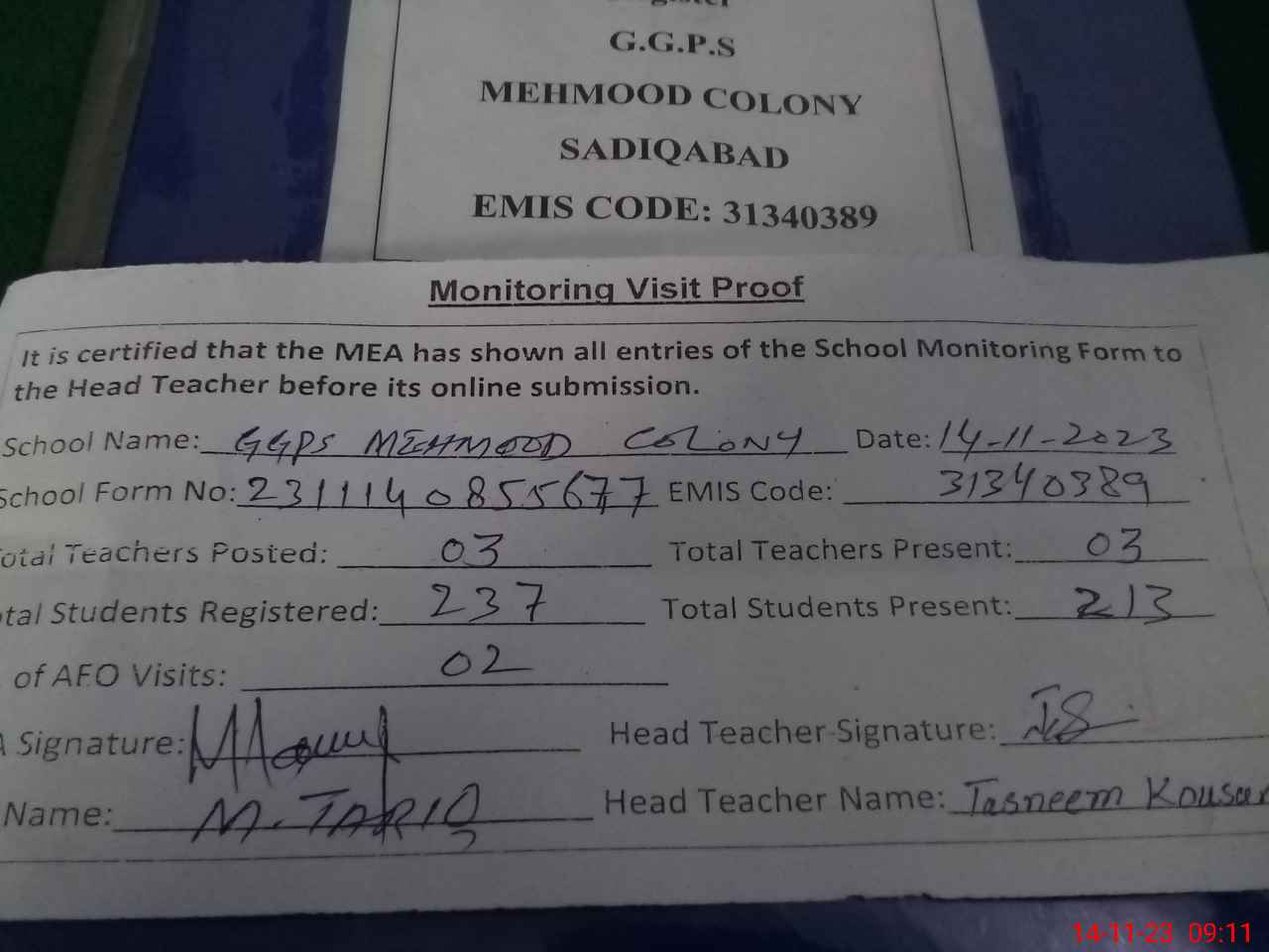 | EMIS Code: 31340389 | Name of School: GGPS MAHMOOD COLONY MUSTAFA TOWN | |||