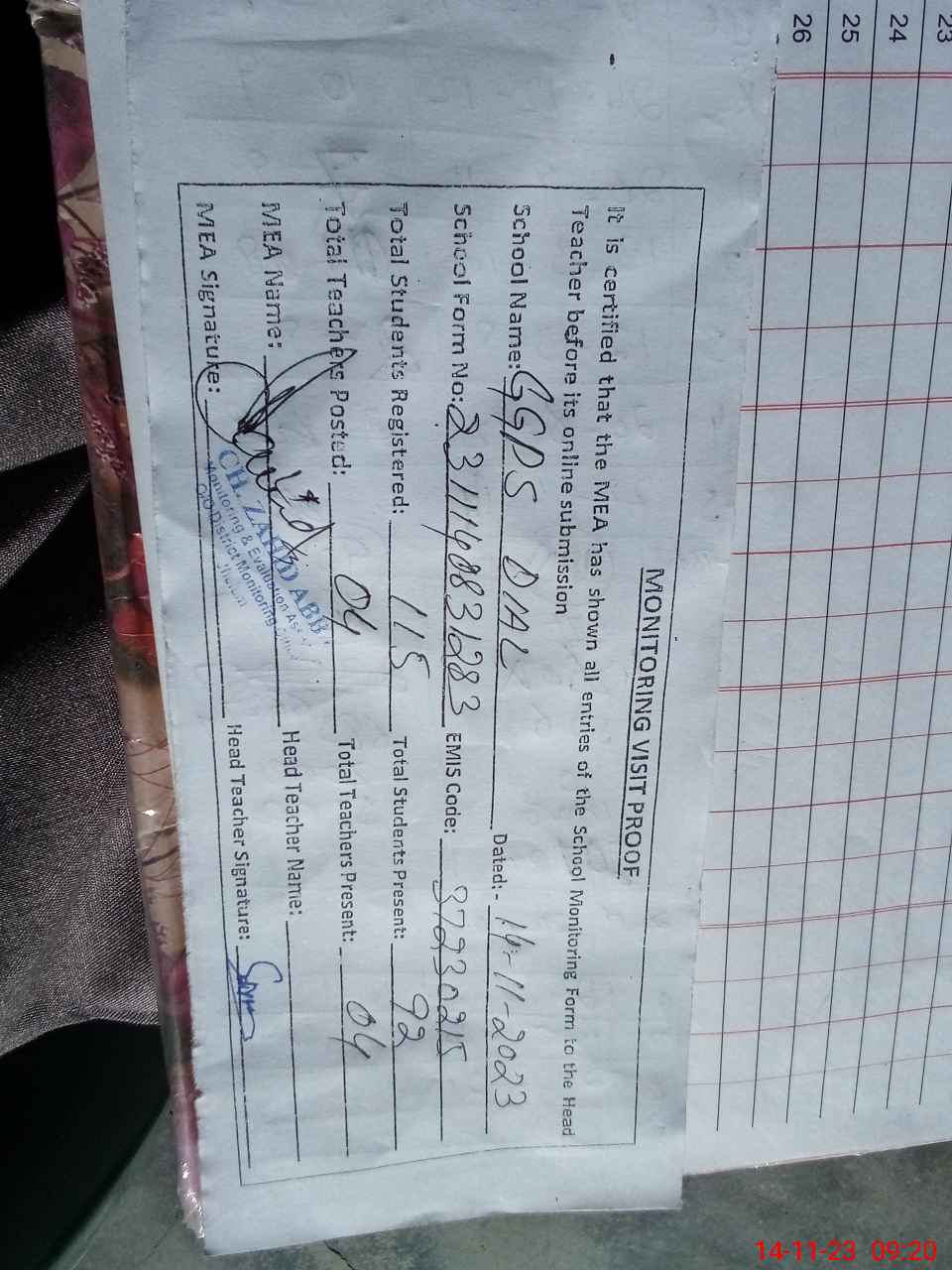 | Monitoring Date: 14-11-2023 | Start Time: 14-11-2023 08:31 AM | End Time: 14-11-2023 09:22 AM | Name of MEA: Za**** Ab**** | |