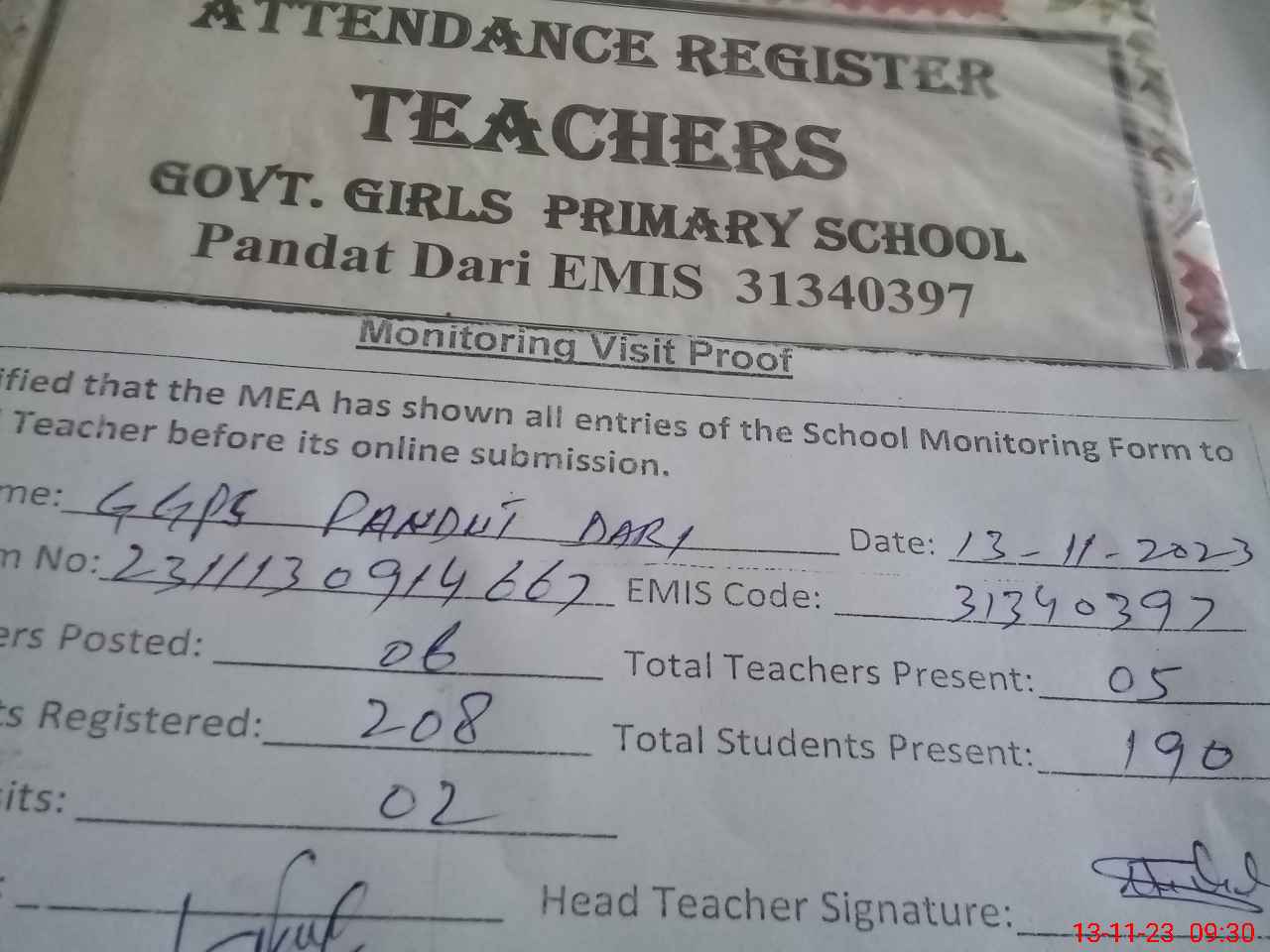 | Attendance Register | Head Teacher | MEA with School | Visit Proof |