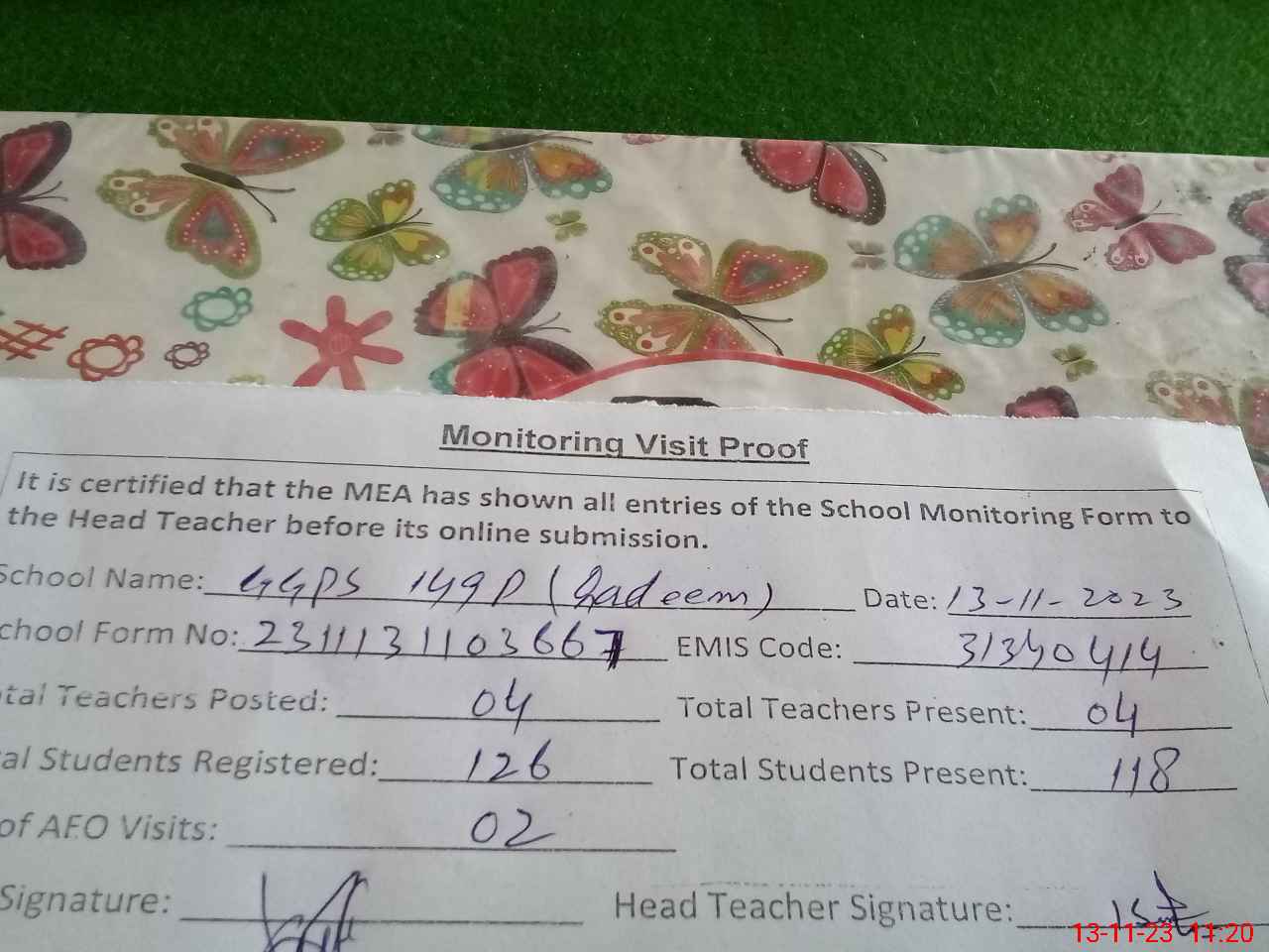 | Attendance Register | Head Teacher | MEA with School | Visit Proof |