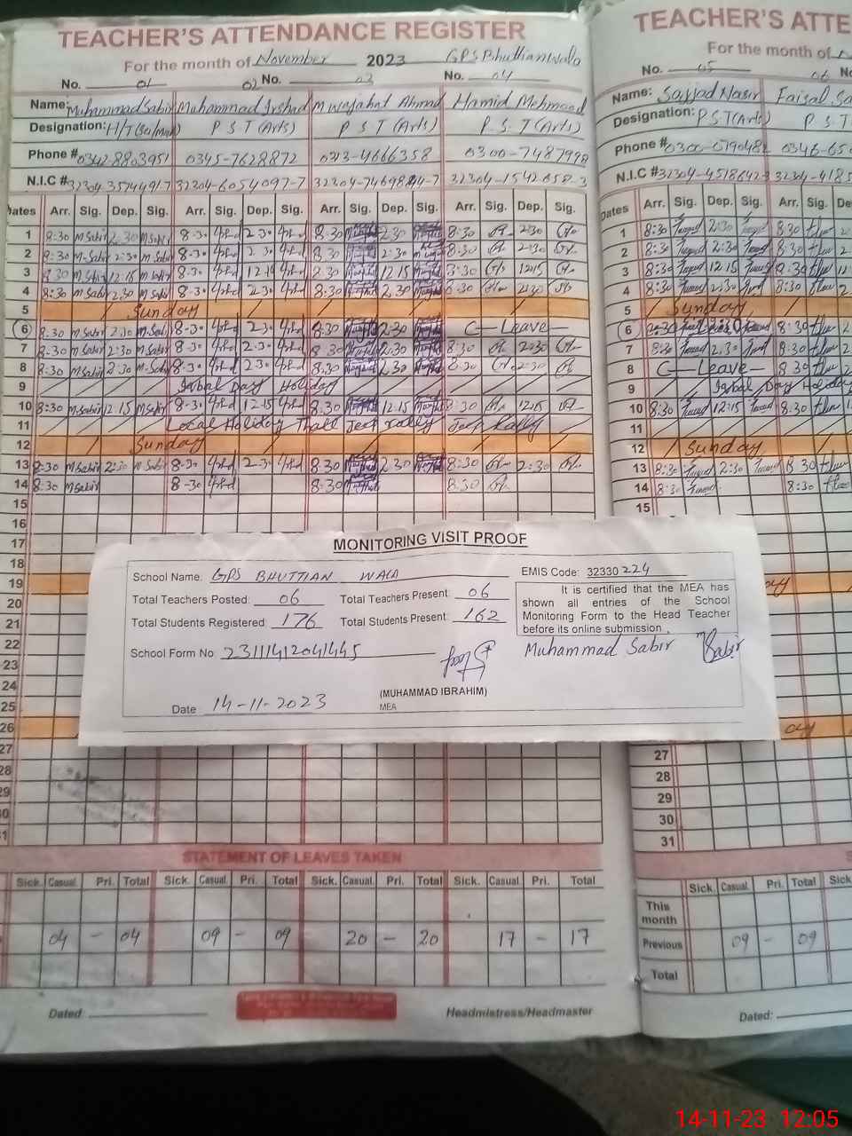 | Attendance Register | Head Teacher | MEA with School | Visit Proof |
