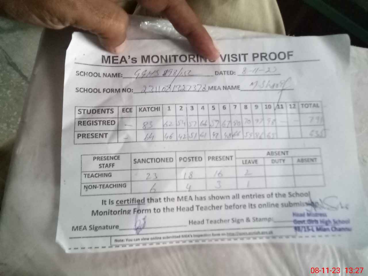 | EMIS Code: 36430088 | Name of School: GGHS 98/15-L, MIAN CHANNU | |||