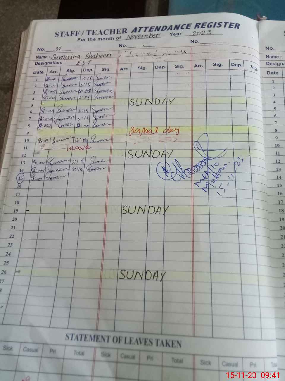 Leave Type | Remarks for today (Leave,Training, Exam,Absent,Late, Other duty) |
