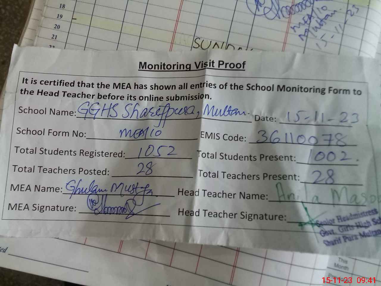 | Attendance Register | Head Teacher | MEA with School | Visit Proof |