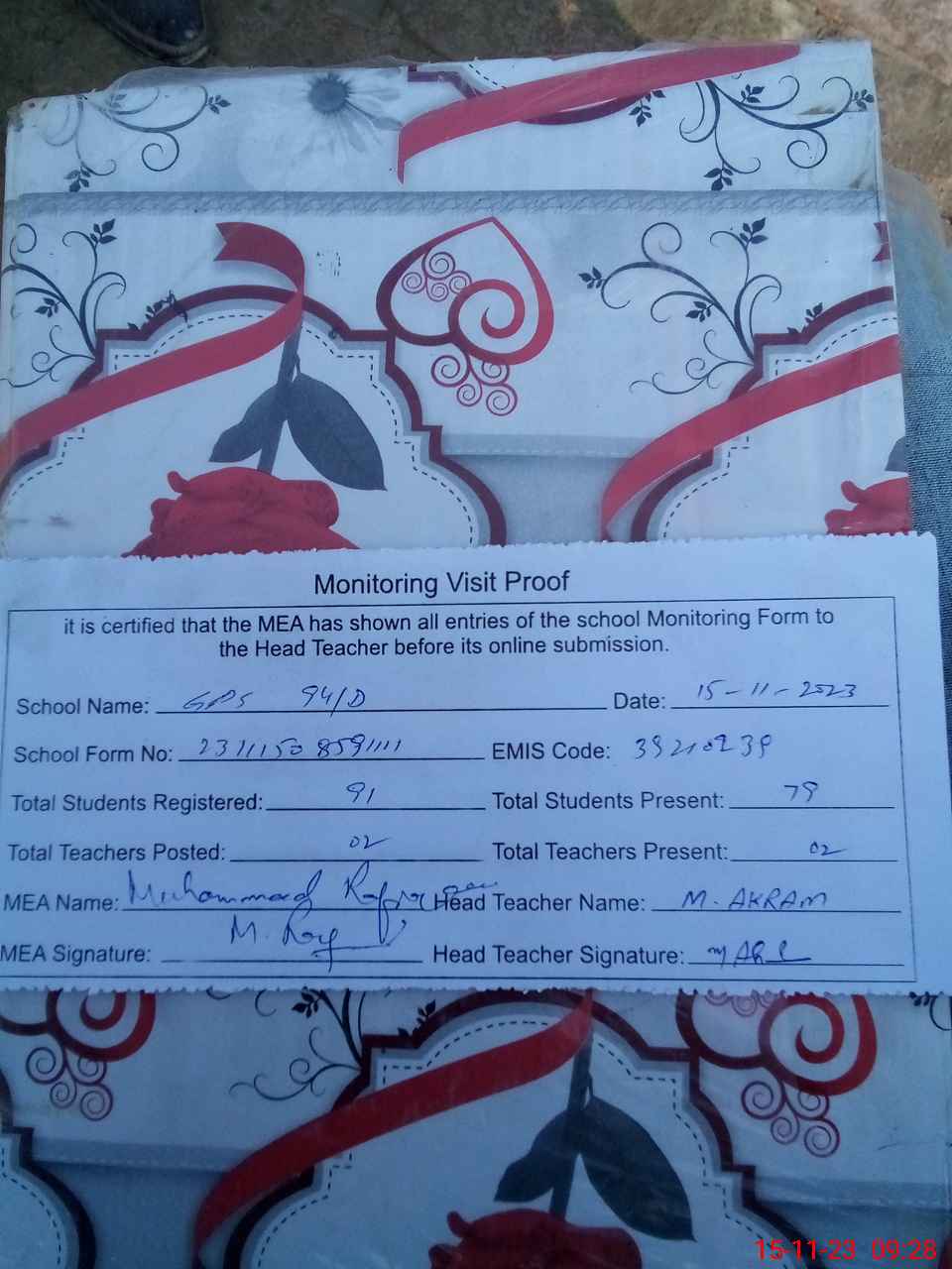 | Attendance Register | Head Teacher | MEA with School | Visit Proof |