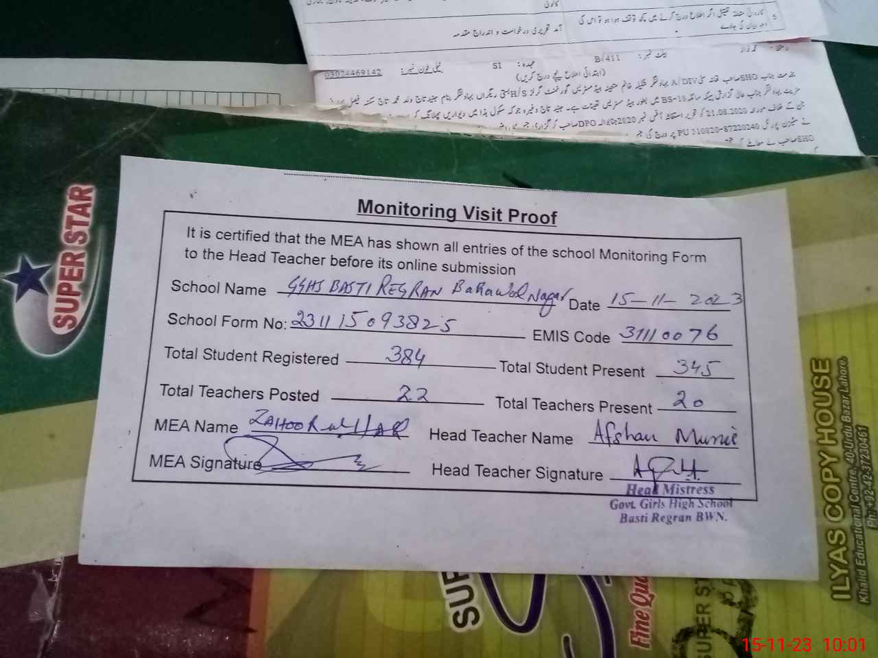 | Attendance Register | Head Teacher | MEA with School | Visit Proof |