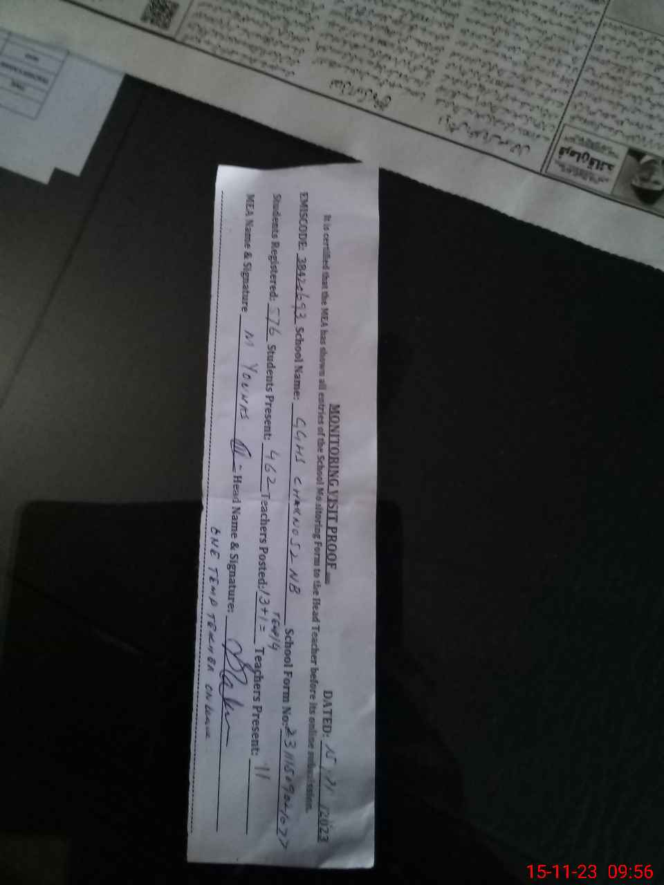 | Attendance Register | Head Teacher | MEA with School | Visit Proof |