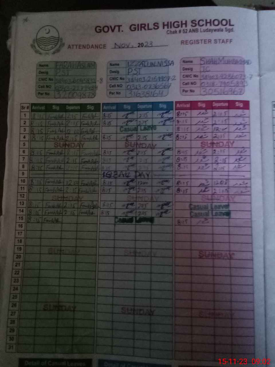 | CNIC | Full Name | Designation | R/C | Absence During Last Calender Month |