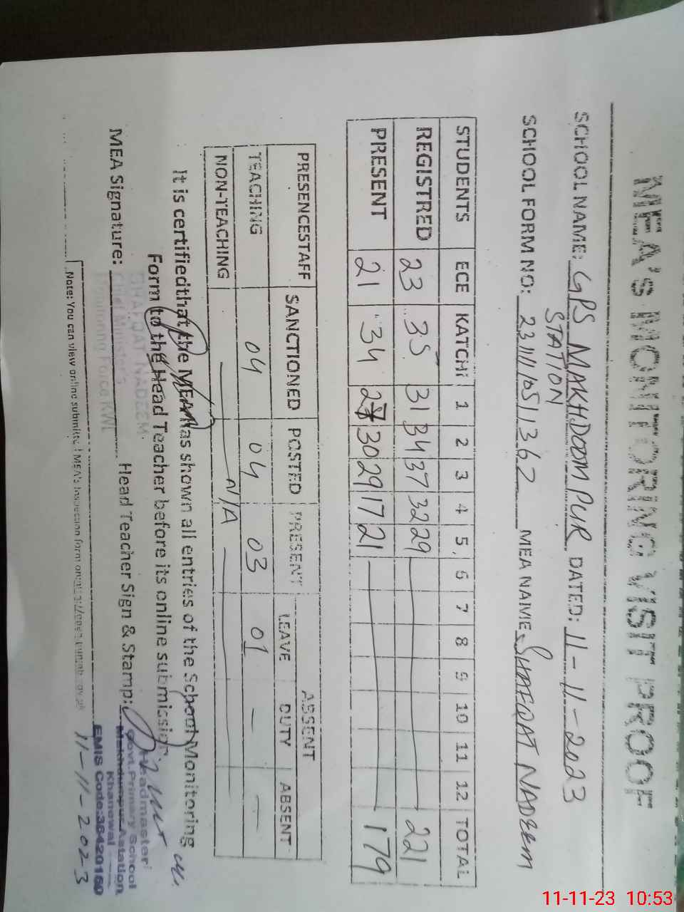 | Attendance Register | Head Teacher | MEA with School | Visit Proof |