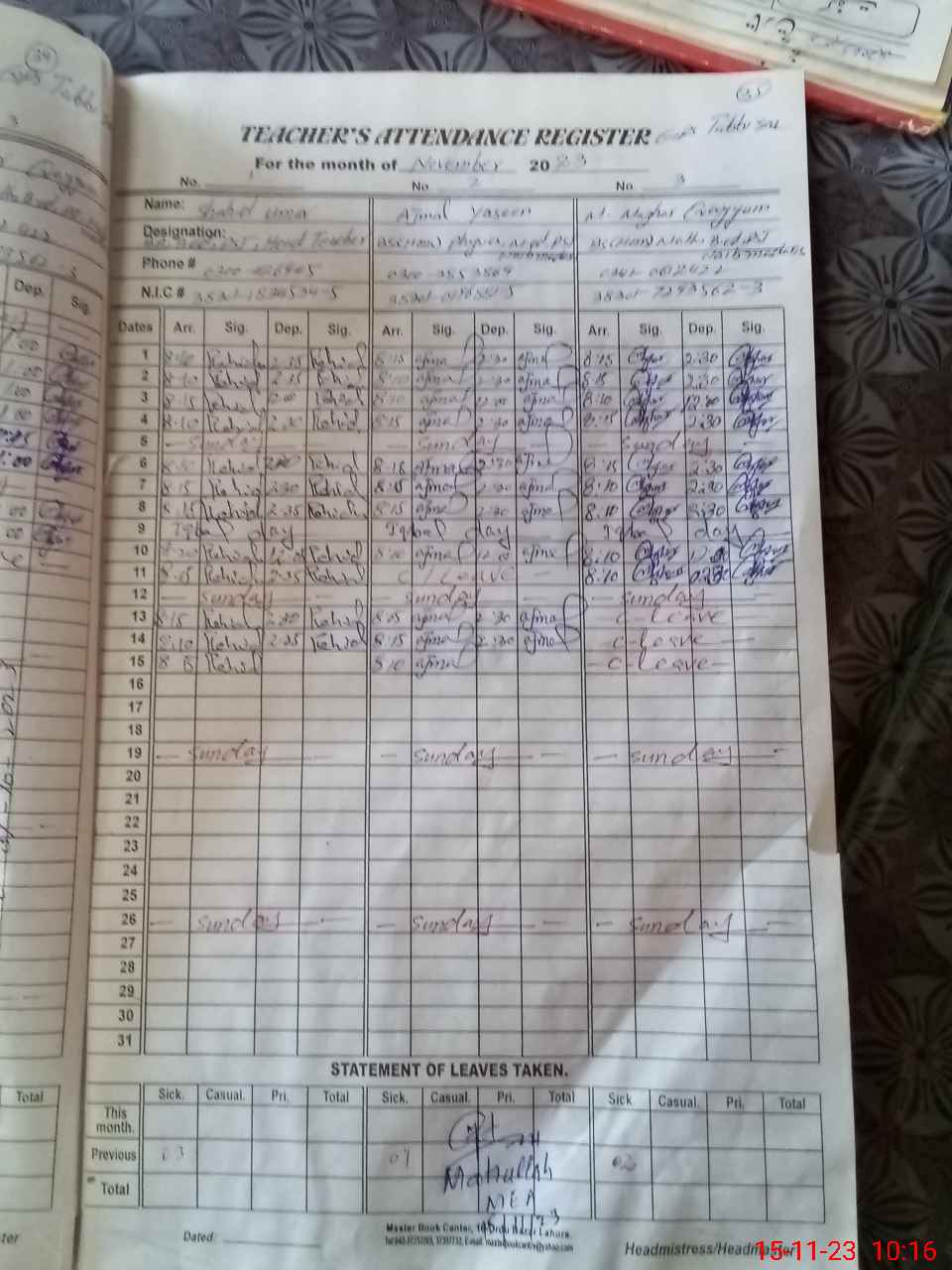 | CNIC | Full Name | Designation | R/C | Absence During Last Calender Month |