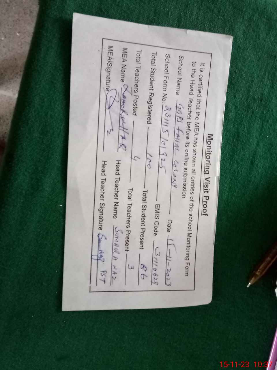 | Monitoring Date: 15-11-2023 | Start Time: 15-11-2023 10:07 AM | End Time: 15-11-2023 10:40 AM | Name of MEA: Za**** BN**** | |