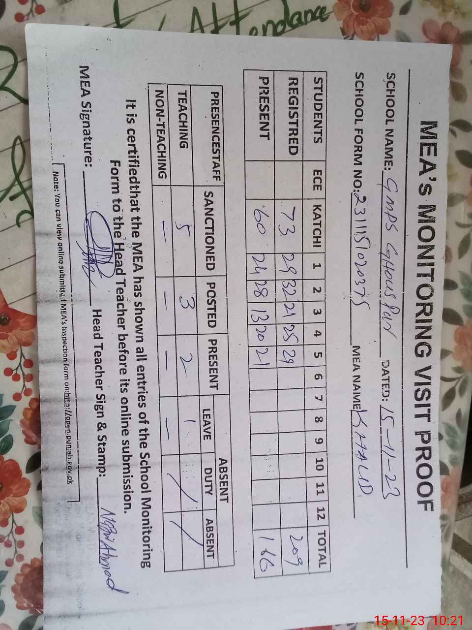 | Attendance Register | Head Teacher | MEA with School | Visit Proof |