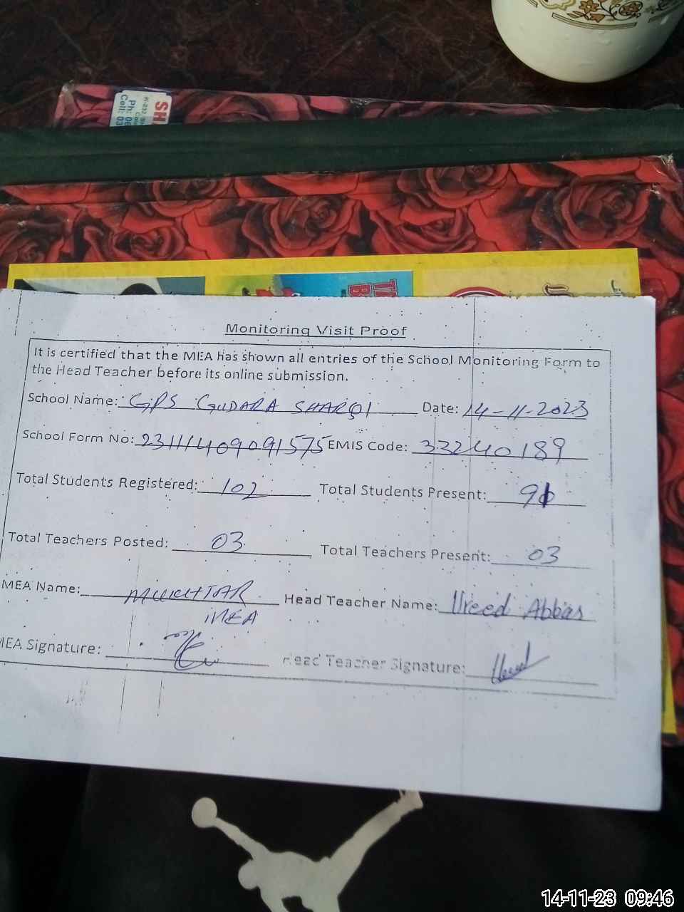 | Attendance Register | Head Teacher | MEA with School | Visit Proof |