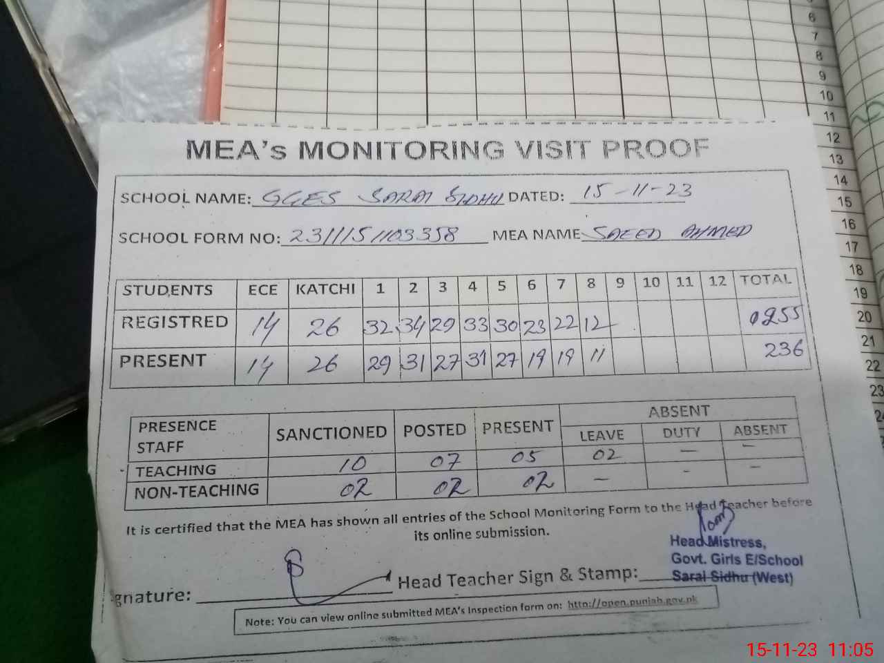 | Monitoring Date: 15-11-2023 | Start Time: 15-11-2023 10:18 AM | End Time: 15-11-2023 11:07 AM | Name of MEA: Sa**** Ah**** | |