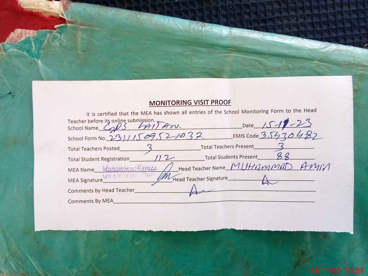 | Attendance Register | Head Teacher | MEA with School | Visit Proof |