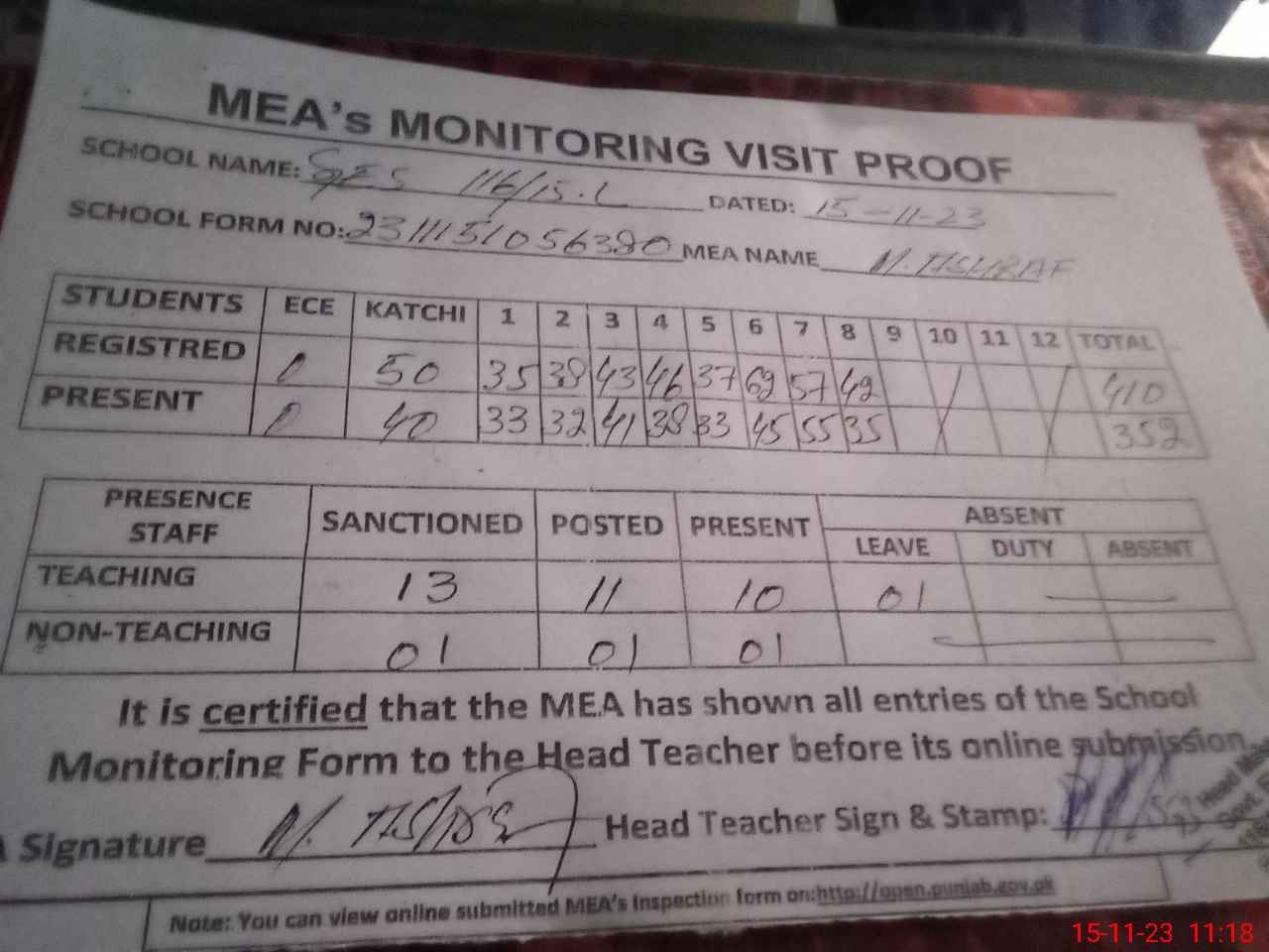 | Attendance Register | Head Teacher | MEA with School | Visit Proof |