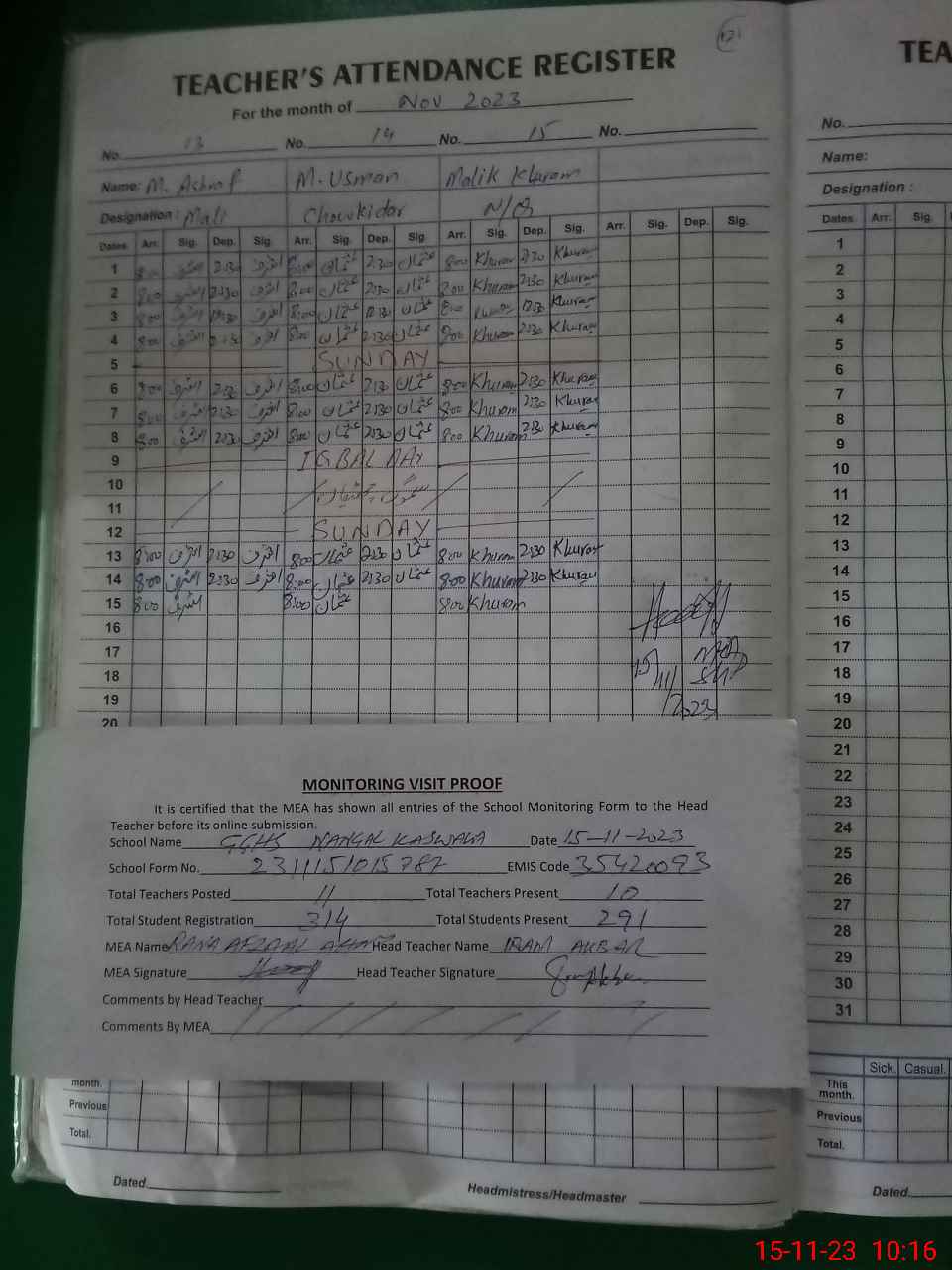 | Attendance Register | Head Teacher | MEA with School | Visit Proof |