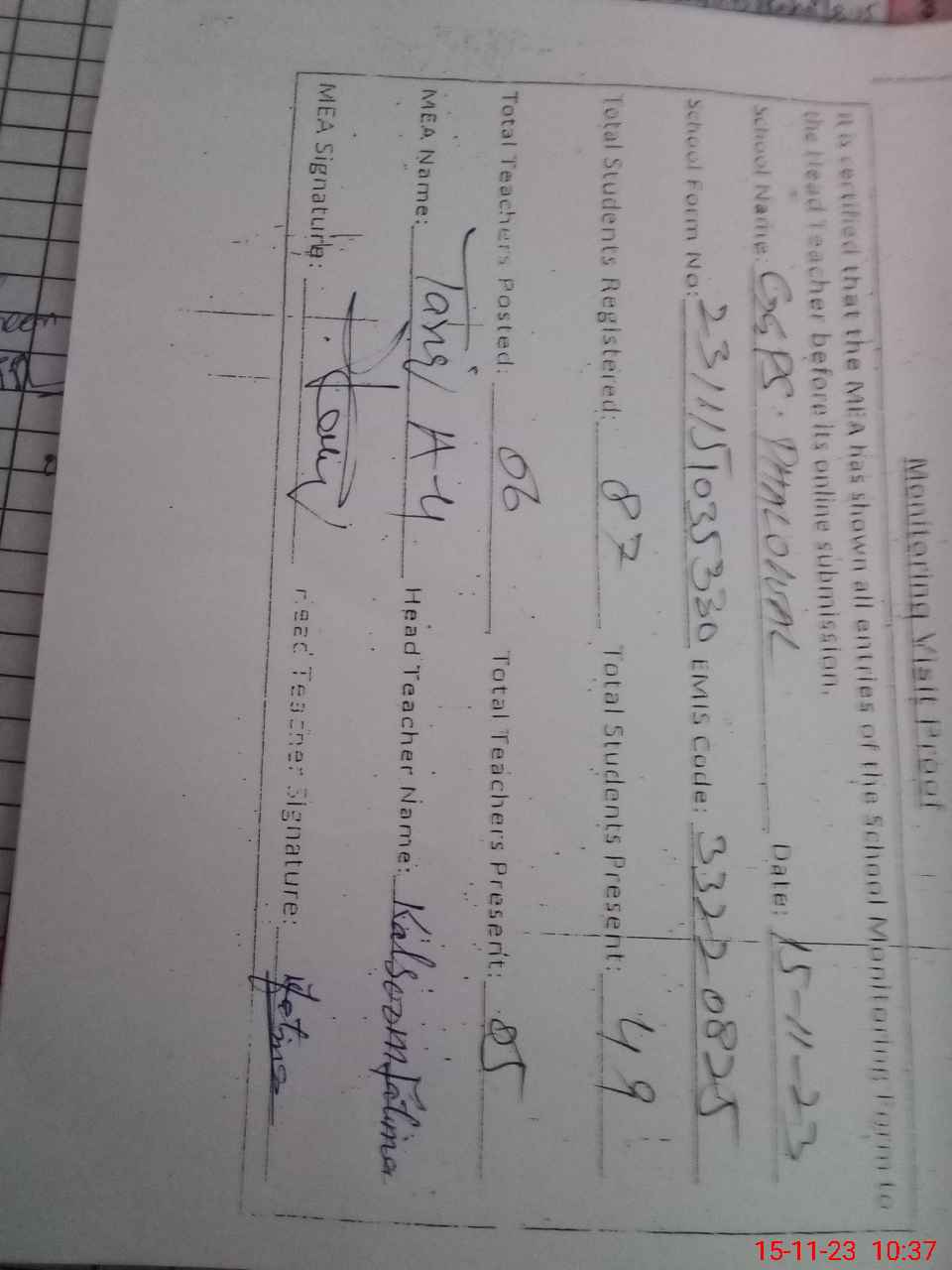 | Attendance Register | Head Teacher | MEA with School | Visit Proof |