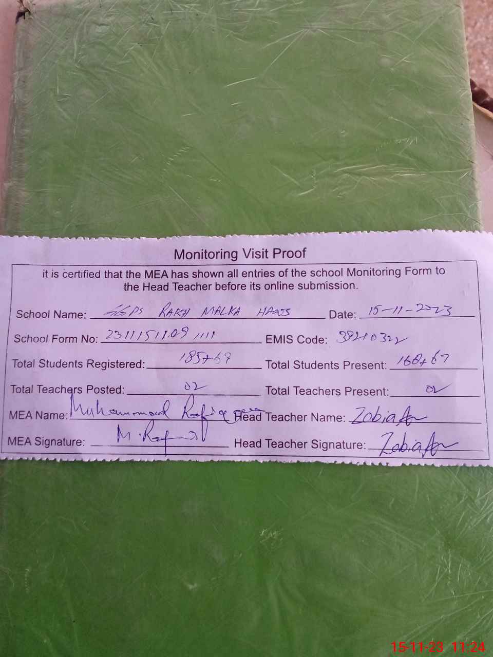 | Attendance Register | Head Teacher | MEA with School | Visit Proof |