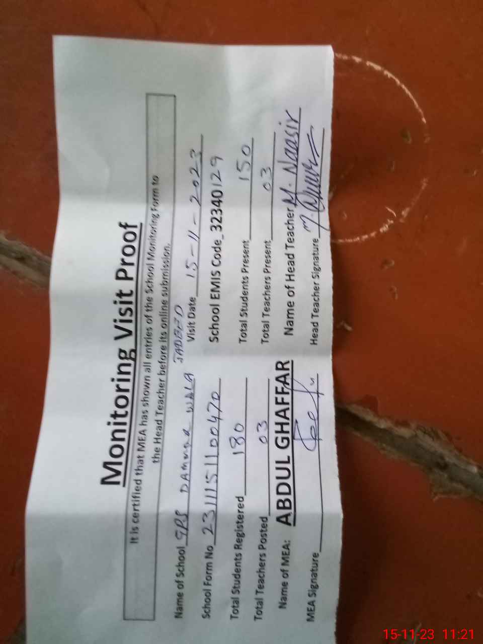 | Attendance Register | Head Teacher | MEA with School | Visit Proof |