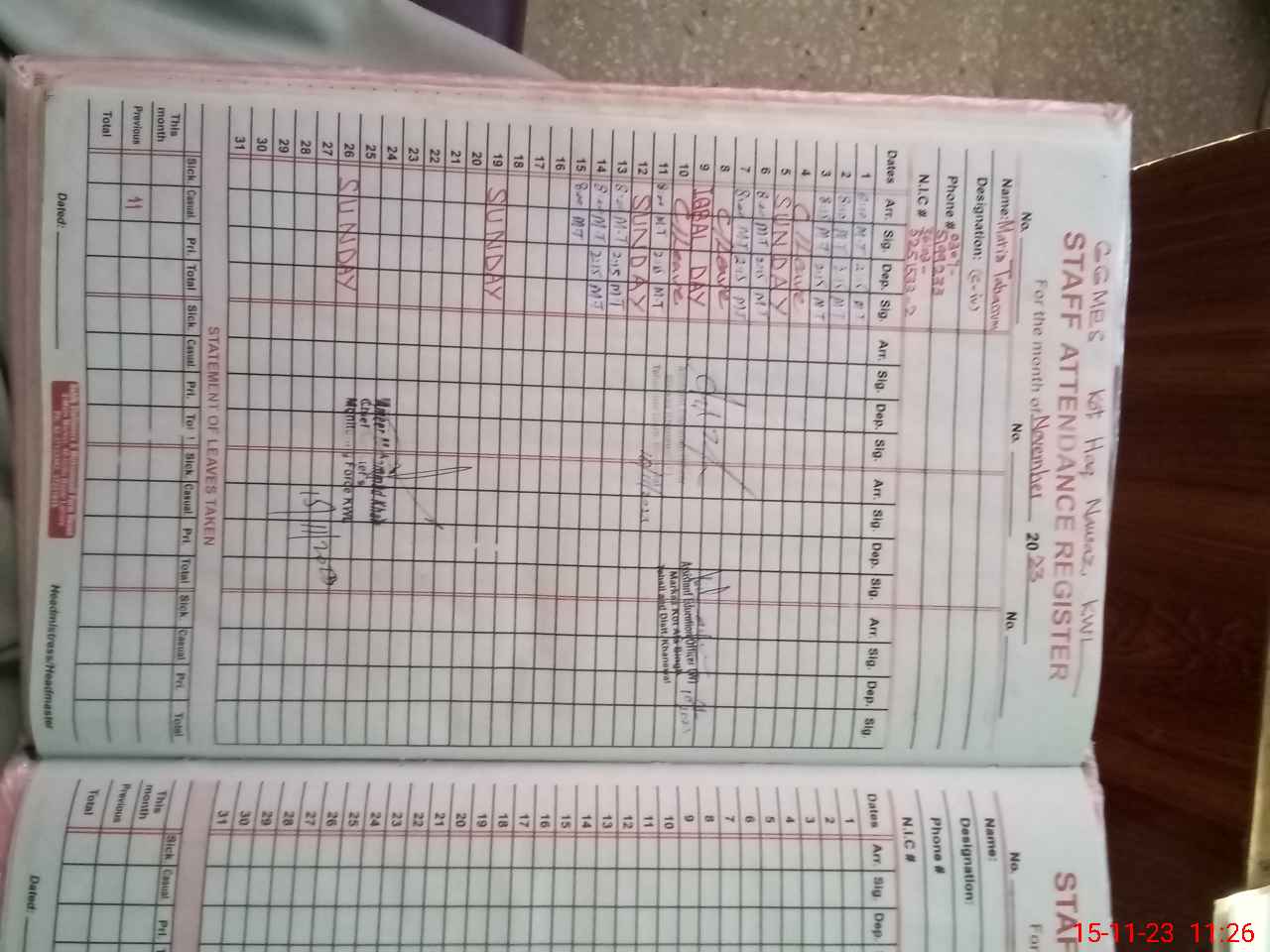 | Remarks (Use Separate Page if Required): EST Arifa Aslam CNIC 3610383509786 absent since 15 November 2022 till now | |||||