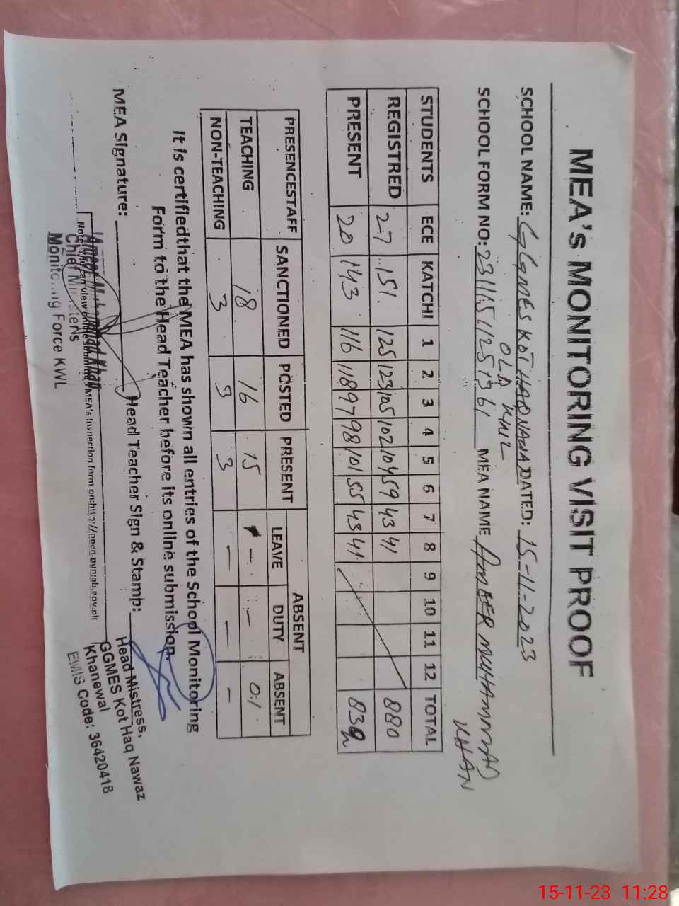 | Attendance Register | Head Teacher | MEA with School | Visit Proof |