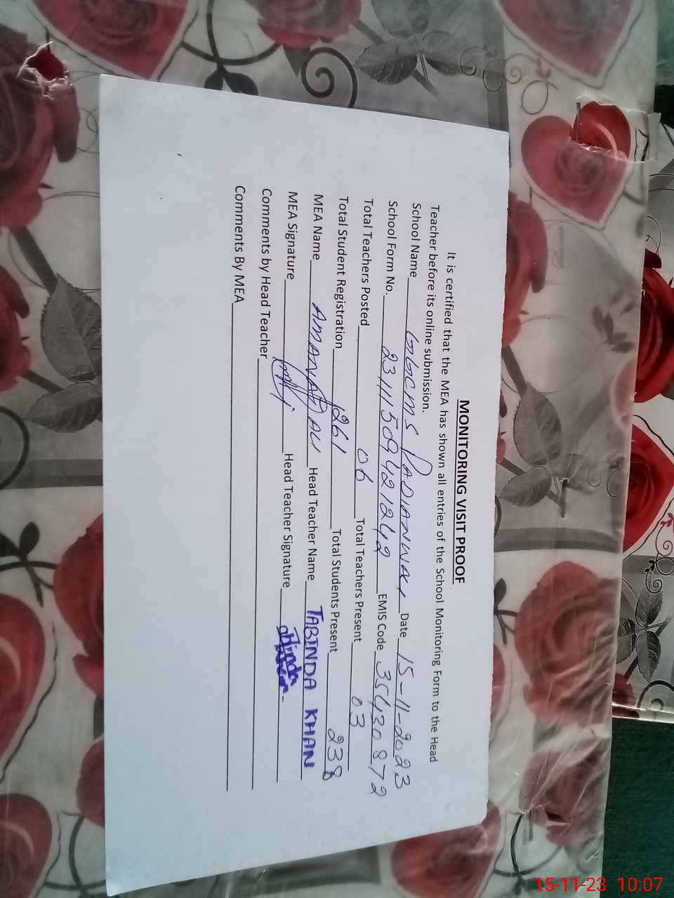 | Attendance Register | Head Teacher | MEA with School | Visit Proof |