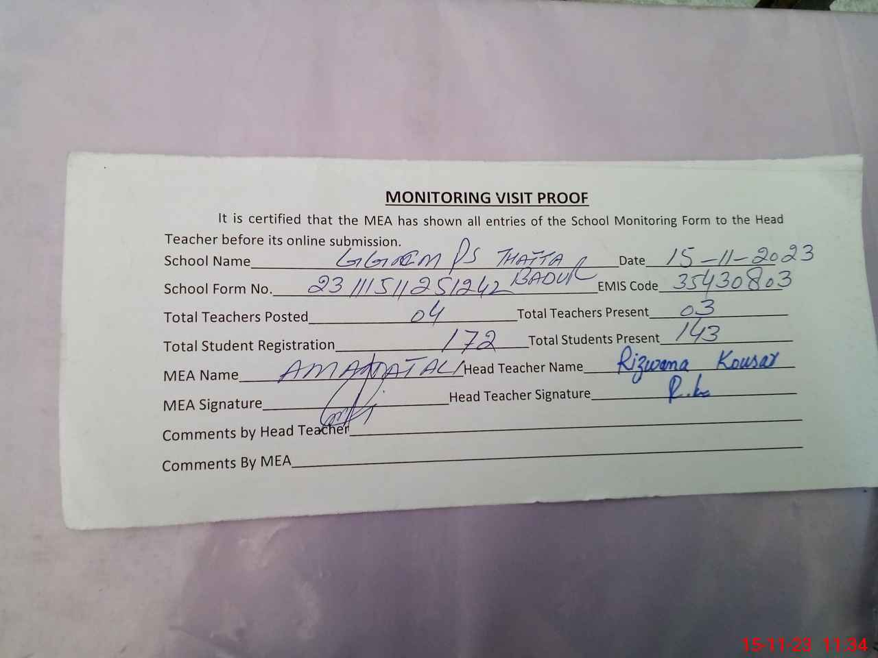 | Attendance Register | Head Teacher | MEA with School | Visit Proof |