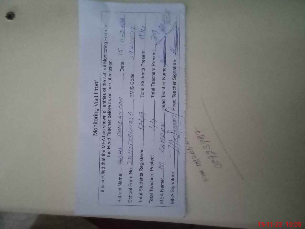 | Certified that this School was Inspected by the Undersigned MEA/DMO Today and the Information Stated Above is as Per Record. | |||||