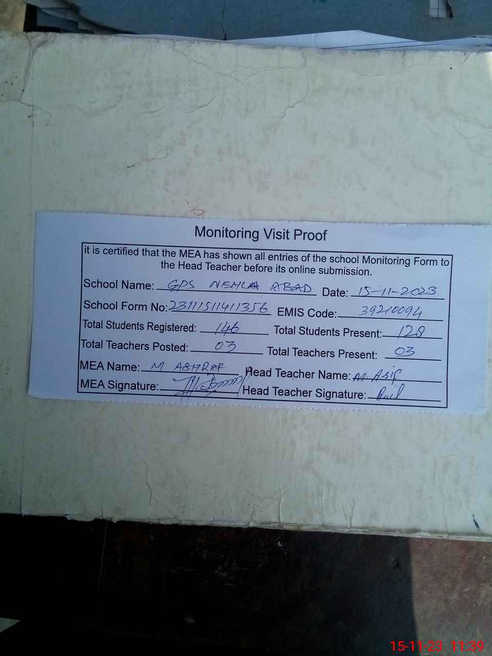 | Attendance Register | Head Teacher | MEA with School | Visit Proof |