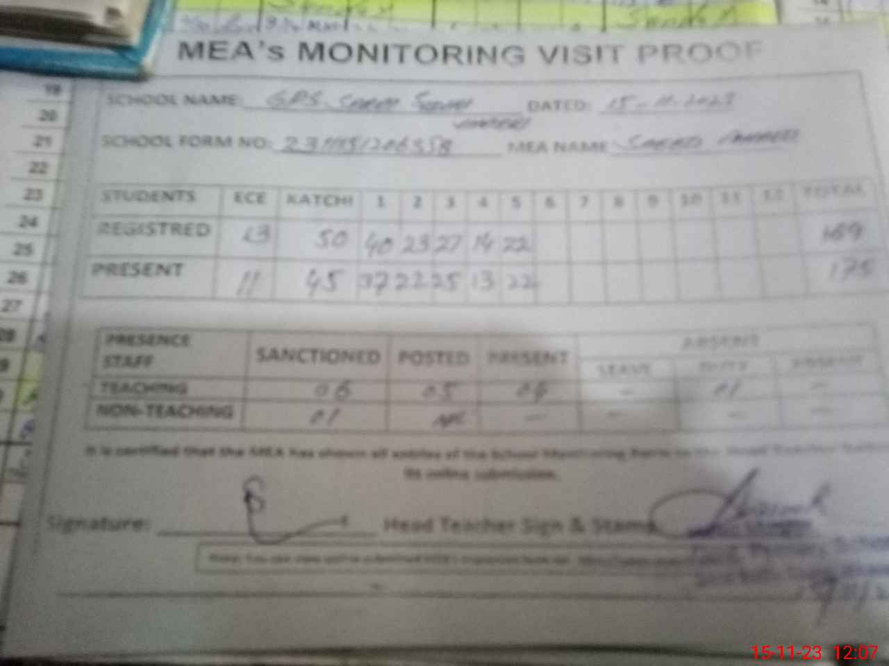 | Attendance Register | Head Teacher | MEA with School | Visit Proof |
