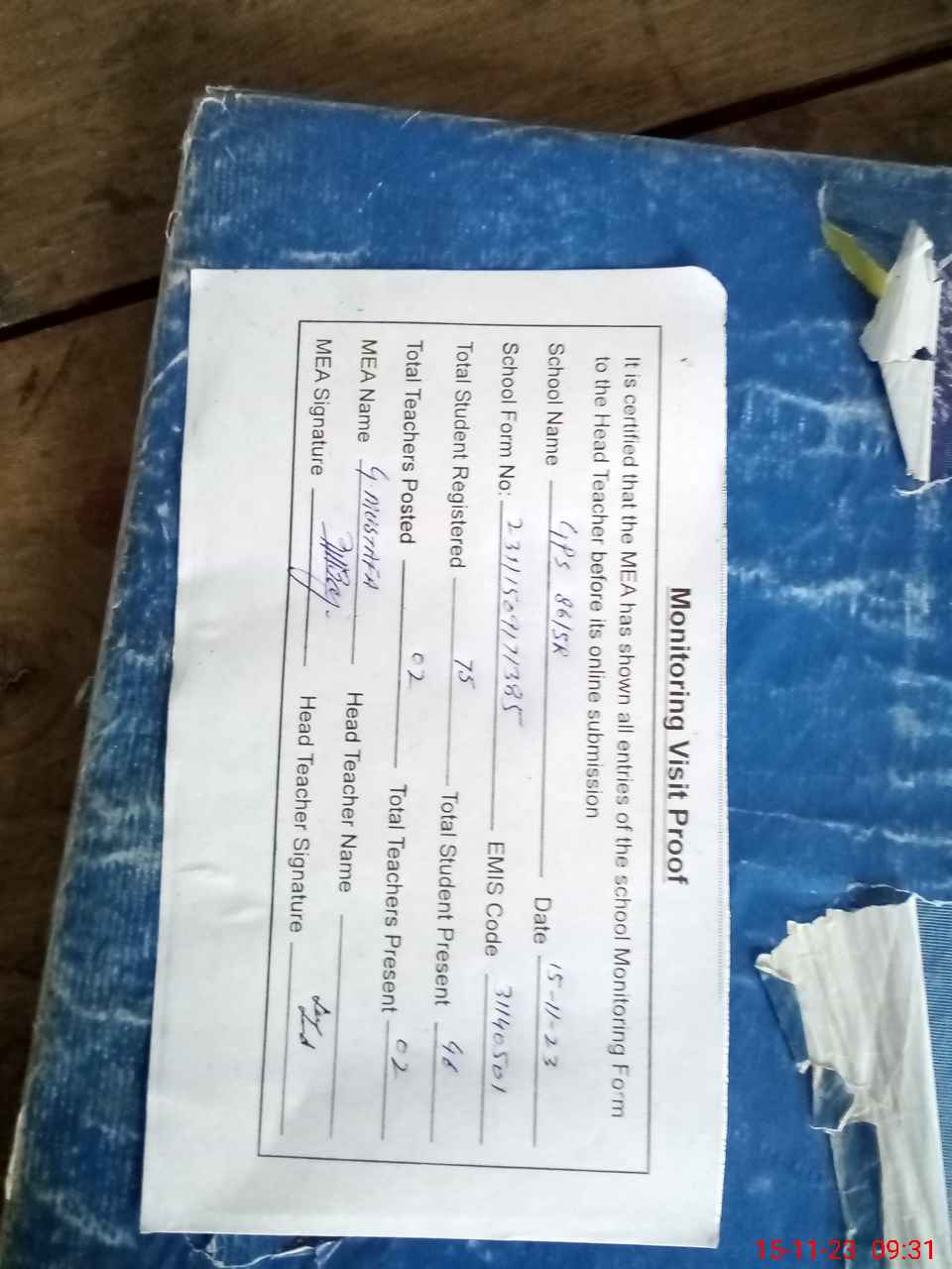 | Attendance Register | Head Teacher | MEA with School | Visit Proof |
