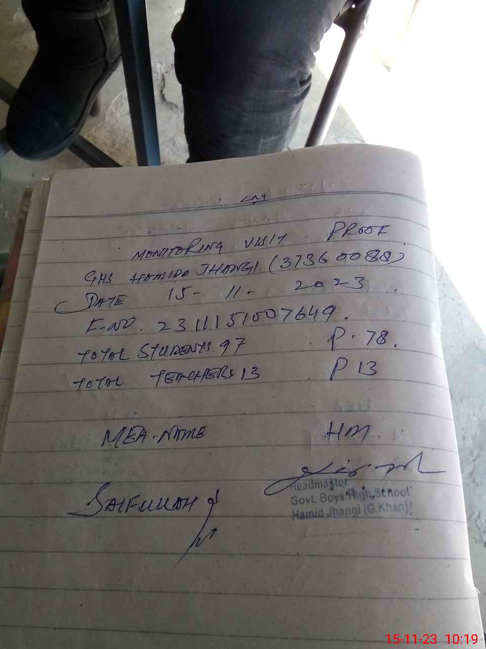| Monitoring Date: 15-11-2023 | Start Time: 15-11-2023 09:42 AM | End Time: 15-11-2023 10:19 AM | Name of MEA: Sa**** | |