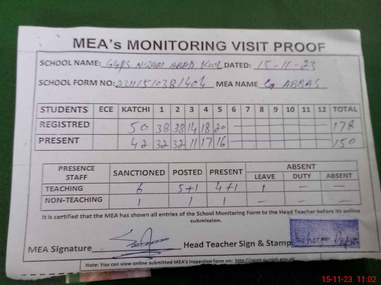 | Attendance Register | Head Teacher | MEA with School | Visit Proof |