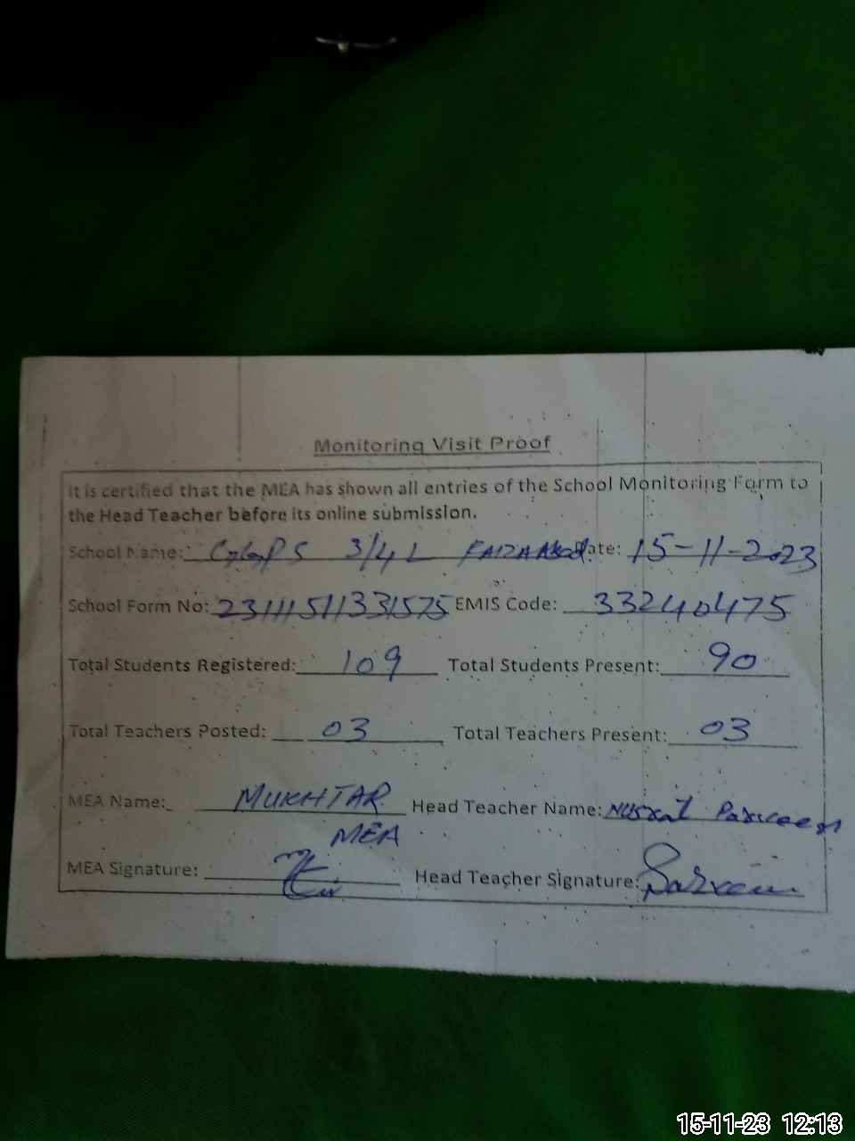 | Attendance Register | Head Teacher | MEA with School | Visit Proof |