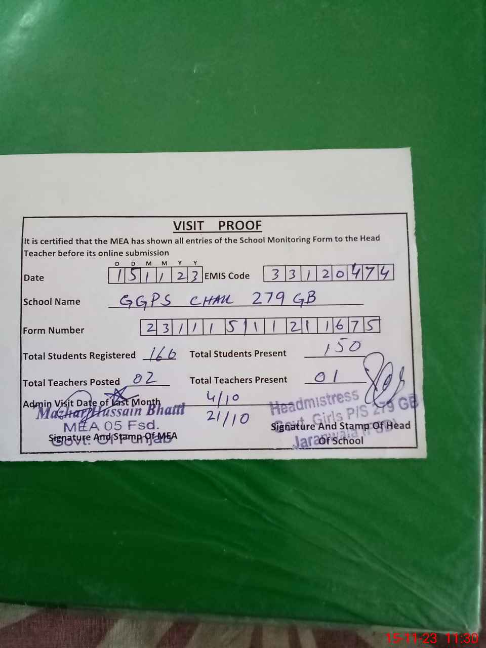 | Attendance Register | Head Teacher | MEA with School | Visit Proof |