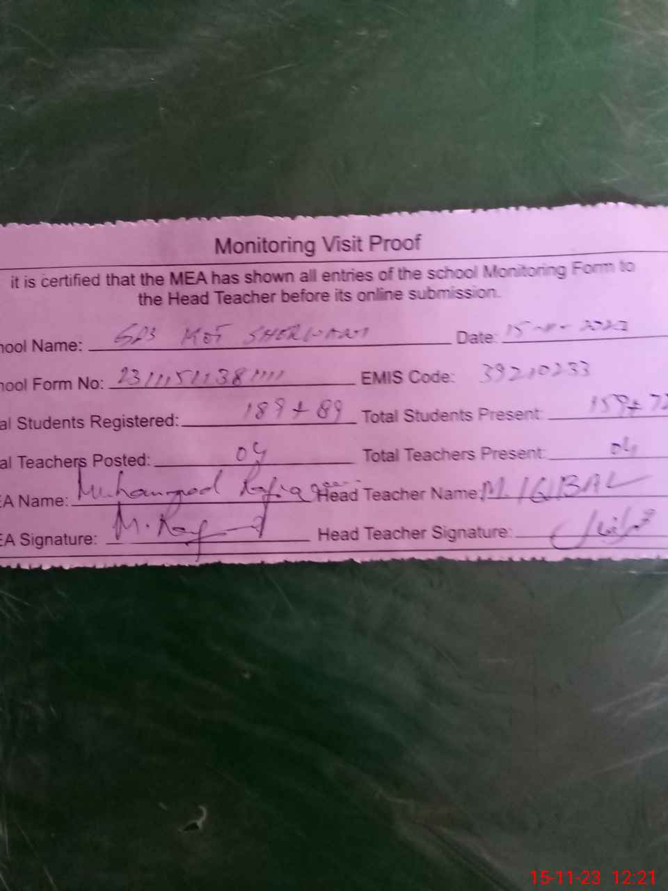 | Attendance Register | Head Teacher | MEA with School | Visit Proof |