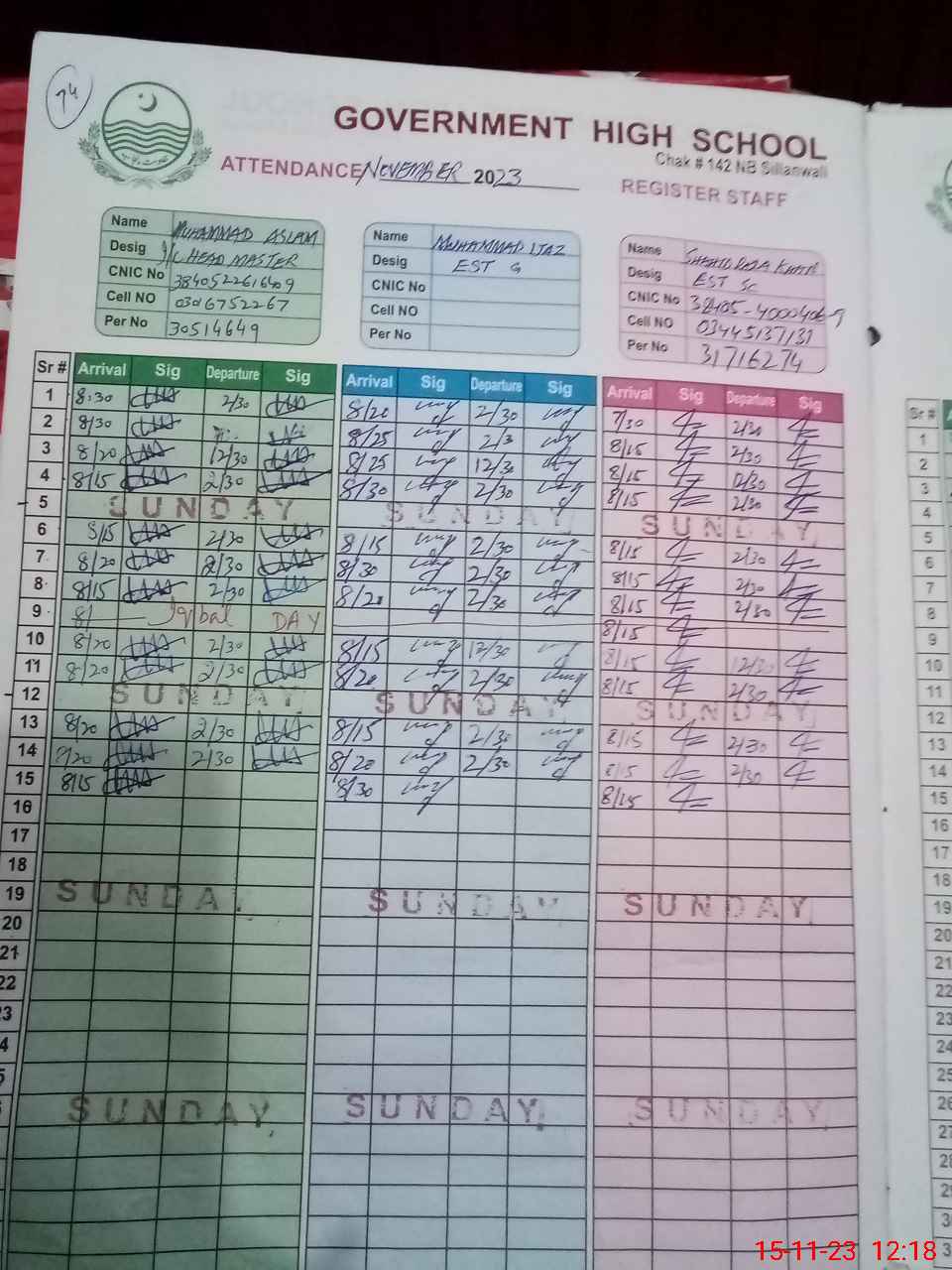 | CNIC | Full Name | Designation | R/C | Absence During Last Calender Month |