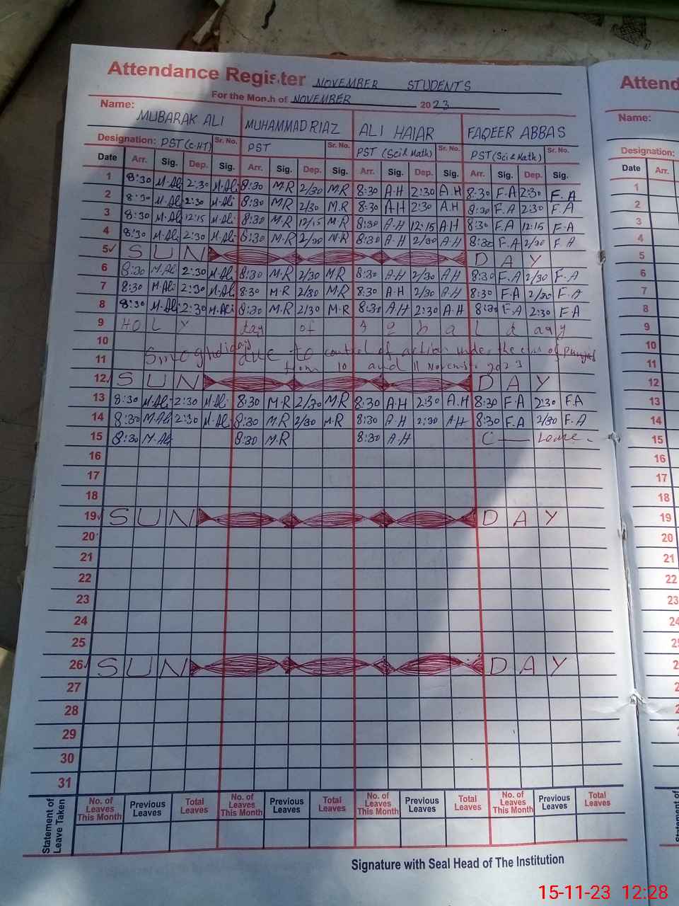 | CNIC | Full Name | Designation | R/C | Absence During Last Calender Month |