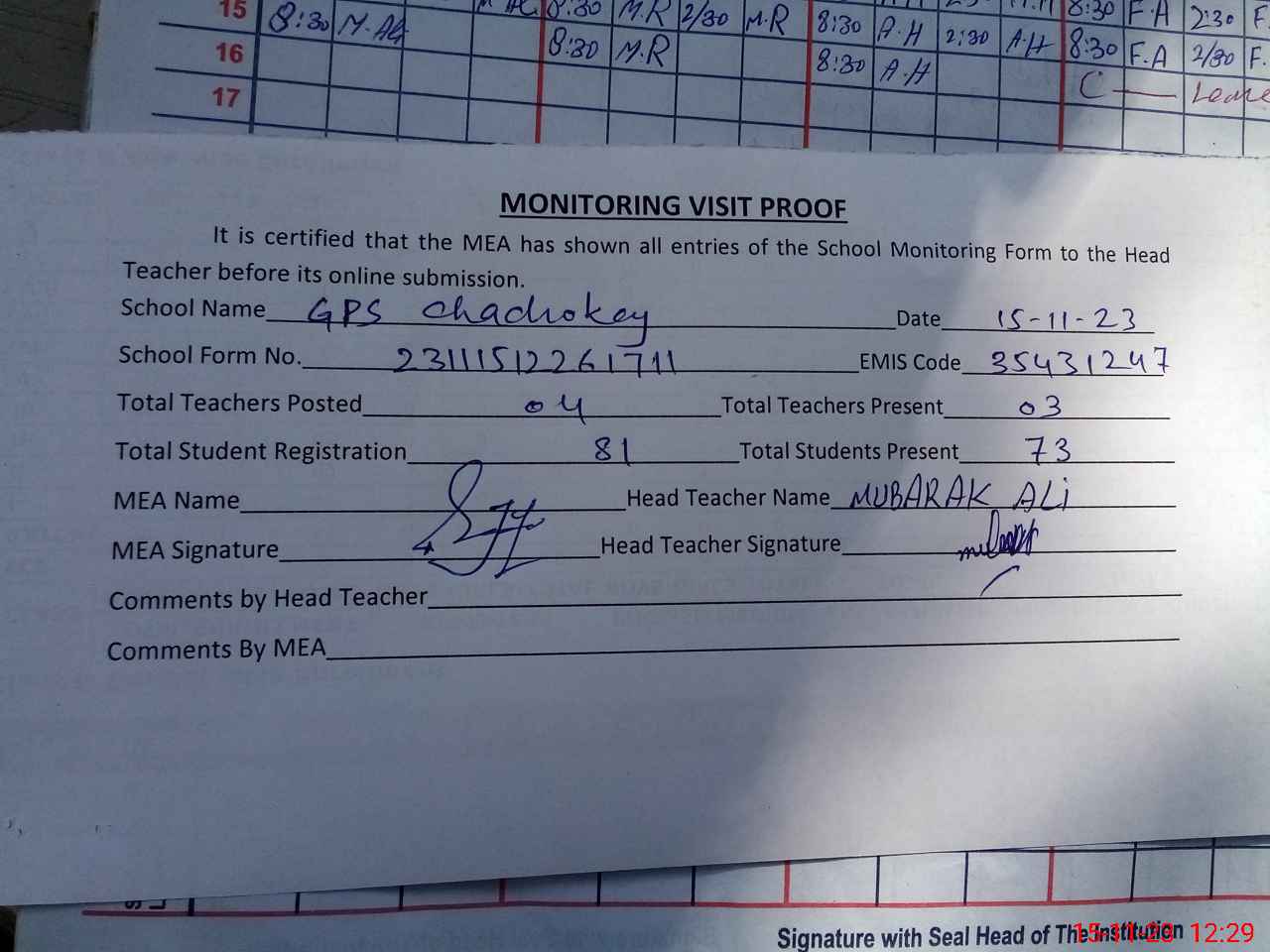 | Attendance Register | Head Teacher | MEA with School | Visit Proof |